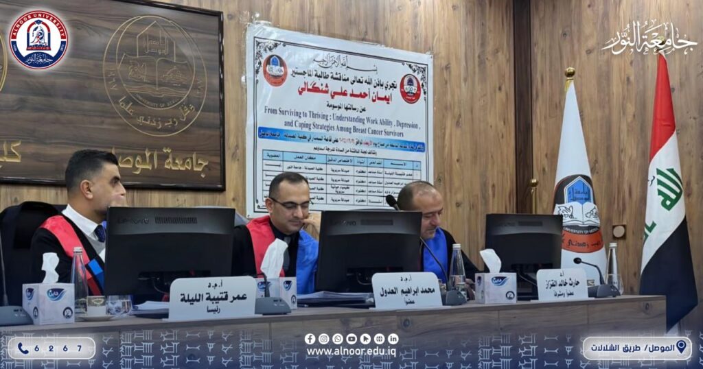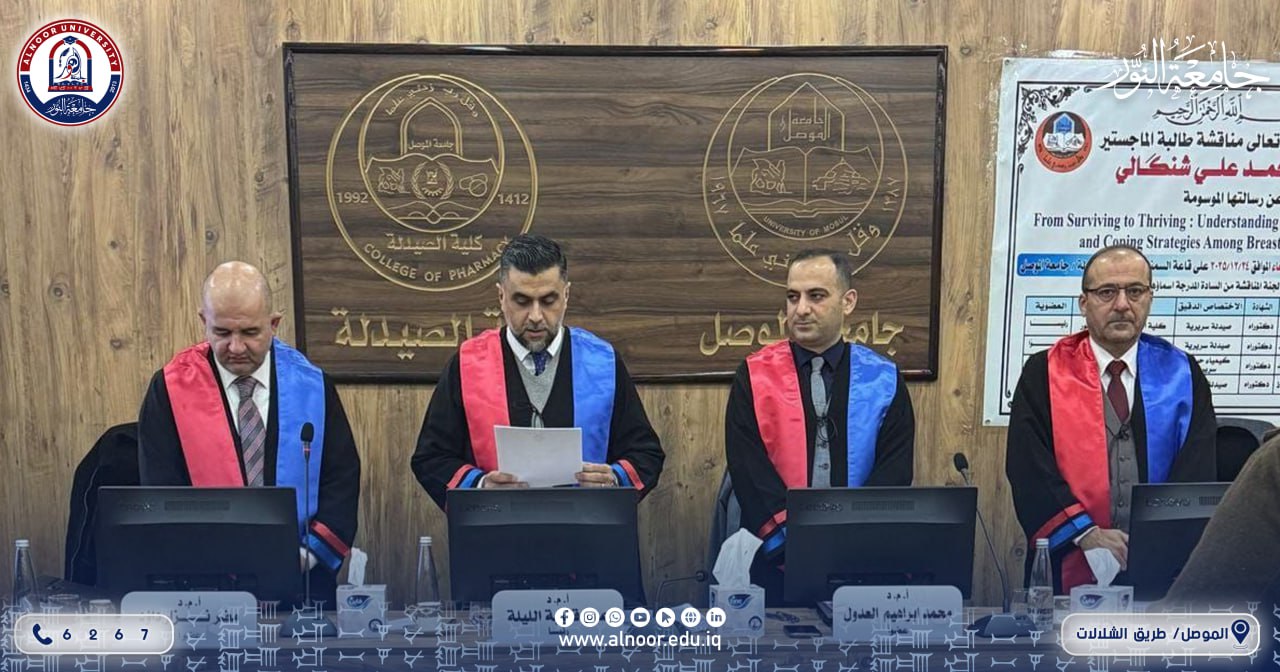 في اطار الحضور العلمي البارز لتدريسيي جامعة النور في الانشطة العلمية بما فيها من لجان مناقشة خاصة بالدراسات العليا فقد ترأس الاستاذ المساعد الدكتور عمر قتيبة بدر الدين الليلة عميد كلية الصيدلة في جامعة النور لجنة مناقشة طالبة الماجستير ايمان احمد علي شنگالي عن رسالتها التي تقدمت بها الى كلية الصيدلة بجامعة الموصل تحت عنوان