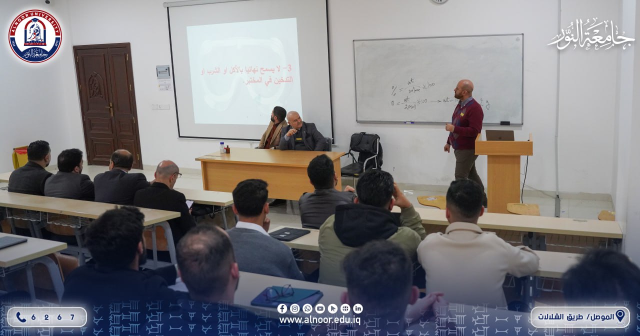 أقامت كلية الصيدلة في جامعة النور ورشة تدريبية متخصصة في مجال السلامة المهنية داخل مختبرات الكيمياء، استهدفت طلبة المرحلة الأولى في الكلية، بهدف تعزيز الوعي بإجراءات الأمن والسلامة وترسيخ السلوكيات المختبرية الصحيحة منذ المراحل الدراسية المبكرة.