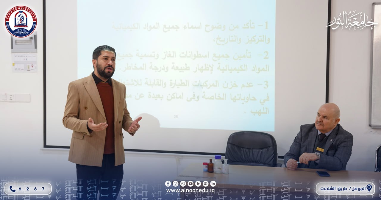 أشرف على الورشة الأستاذ الدكتور شاكر محمود سعيد، فيما حاضر فيها المدرسان المساعدان طيف أنمار وعمر محمد، حيث تضمّنت محاور نظرية وعملية تناولت أسس التعامل الآمن مع المواد الكيميائية، وآليات الوقاية من المخاطر المحتملة داخل المختبرات، فضلاً عن التعريف بطرق استخدام أدوات الحماية الشخصية وإجراءات الطوارئ.